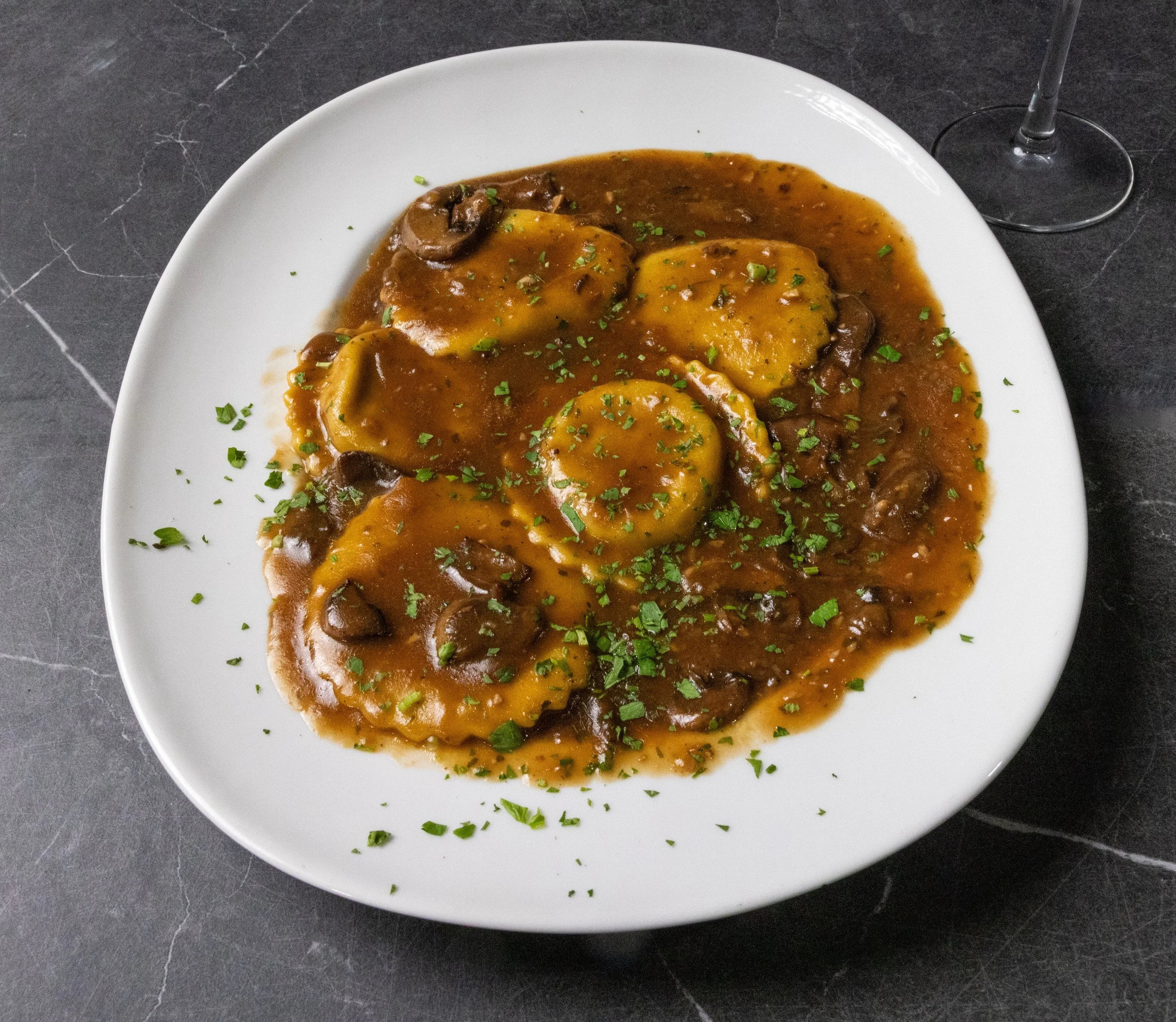 Ravioli stuffed with slow braised short rib topped with mixed mushrooms in an oak & eden brown demi sauce