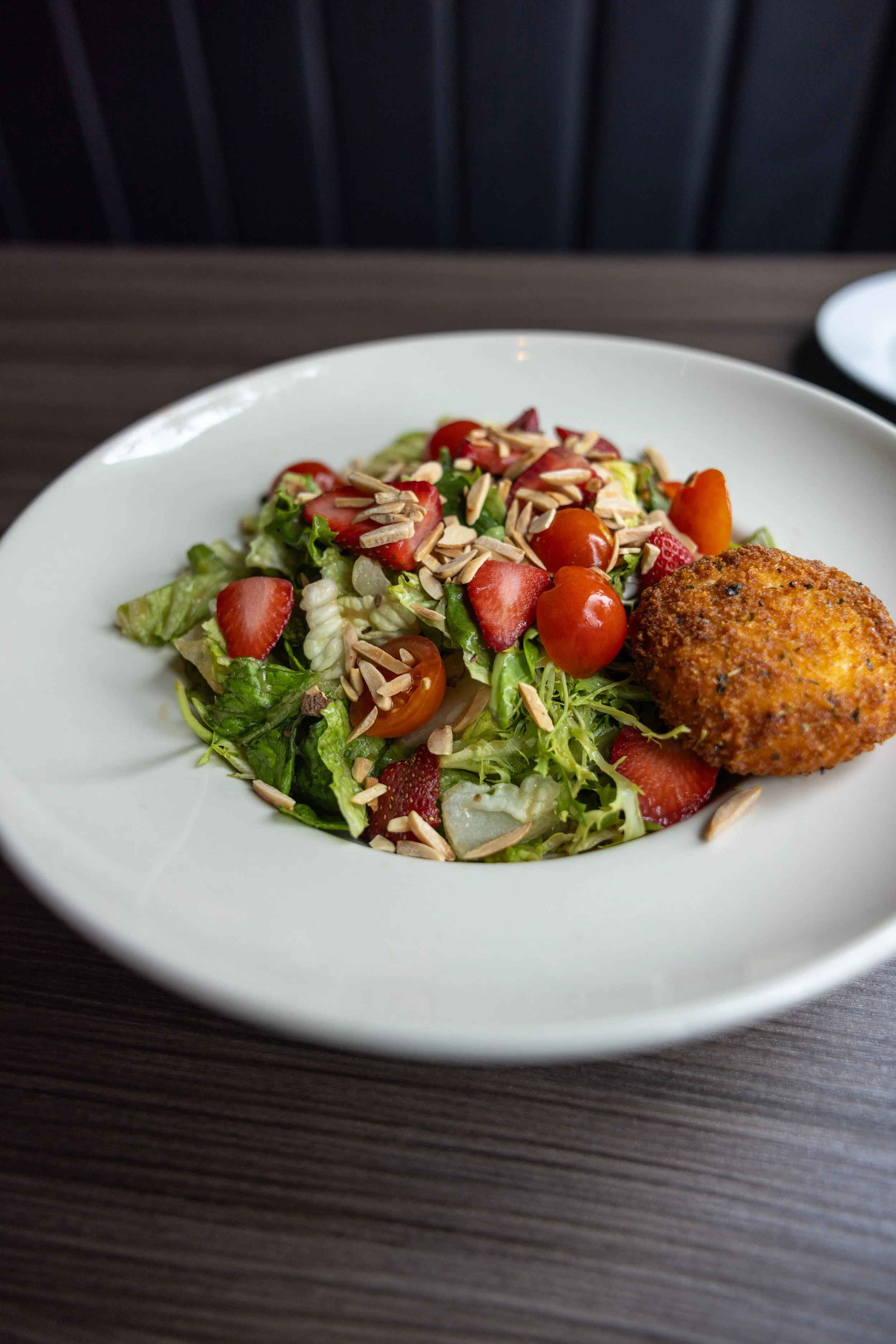 Mixed greens, strawberries, fried goat cheese with roasted almonds tossed in balsamic vinaigrette